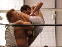 高梨がソバット、諸橋ロープに飛んでフェースクラッシャー、高梨が顔面にドロップキック(左写真)。諸橋ナックル連打、高梨にタッチ。