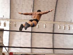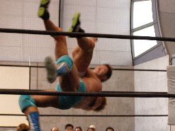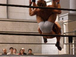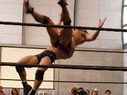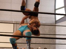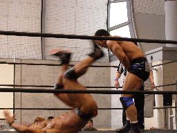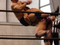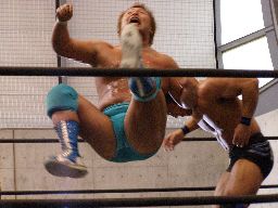 松永がバックフリップ、マイケルがコーナーからボディプレス、カウント2。マイケルコーナーに上る、諸橋起き上がって肩車に。高梨がコーナーから飛んで回転式ネックブリーカー(左写真)、松永がカット。