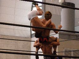 松永バックドロップ(右写真)、諸橋がカット。松永はマイケルにタッチ。10分経過。