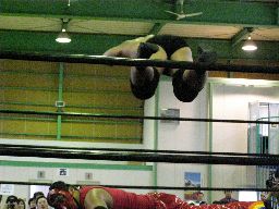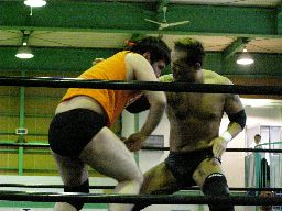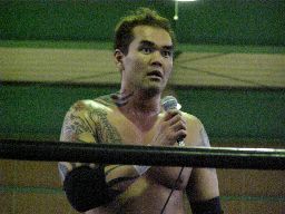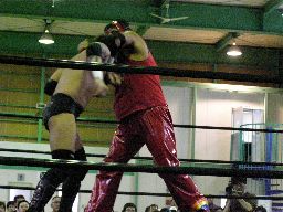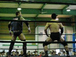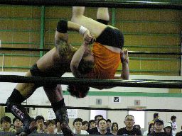 矢郷コブラ狙う、アントンは卍に切り返す(右写真)、矢郷持ち上げるがアントンはエビ固めに、カウント2。アントンバックハンドチョップ、カウント2。