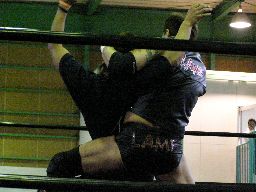Kooロープで顔面こすり、カバー、カウント2。チンロックで締め上げターンバックルに、高木がふらふらと帰って来たところを抱え上げてサイドウォークスラム(左写真)。アントンにタッチ。