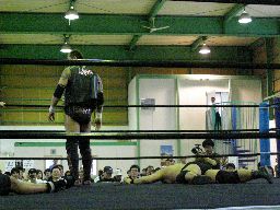 そこにaWoの2人(左写真)。アントン「ちょっと待て!試合前というのになんだこの惨事は!人殺しコブラツイストを使ったようだな?しかし我々には通用しない。お前がコブラを出す前に仕留める!」