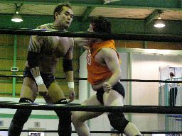 矢郷ヘッドロック、アントンロープに振る、矢郷ショルダーブロック。チョップの打ち合い(右写真)。
