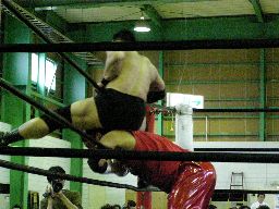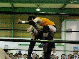 高木はうつぶせのKooに対しロープの間を3往復してからアルティメット・ウォリアー式スプラッシュ(右写真)、カウント2。