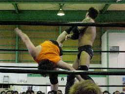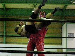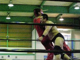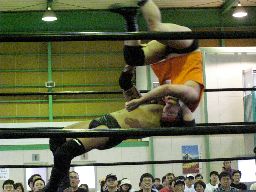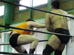 アントンのチョップをかわして矢郷河津落とし(右写真)。矢郷サッカーボールキック、アントンかわす。両軍タッチ。