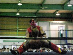 矢郷コブラ狙う、アントン必死に逃げる(左写真)。アントンドロップキック、Kooにタッチ。