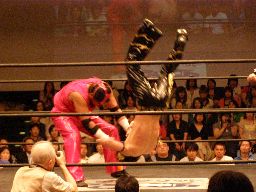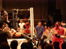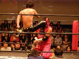 場外に落ちたKooにKUDOはコーナーからダイビングダブルニーアタック(右写真)。なぜか今日場外マットがなかったため双方にダメージ。KUDOが先にリングに戻るがKooはカウント16でも立てない。KUDOが場外からKooをリングに戻す。