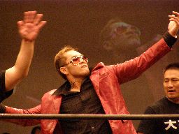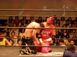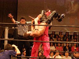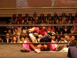 KUDOエプロンに出てスワンダイブ狙うがKooはのどをキャッチ(左写真)。しかしKUDOはチョークスラムに来るところを逆上がりでかわして逆さ押さえ込み。