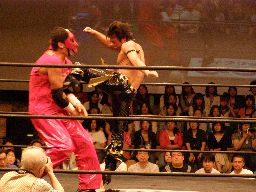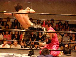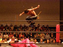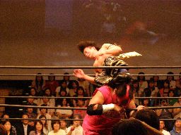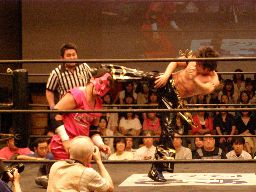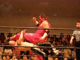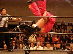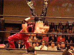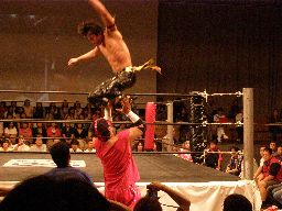 KUDOコーナーに上ってダイビングダブルニードロップ(右写真)、カウント2。