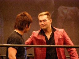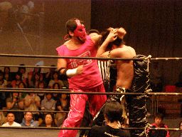 Koo逆水平(左写真)、チョップ打ち合いに。Kooヘッドロック、KUDOロープに振る、Kooショルダーブロック。