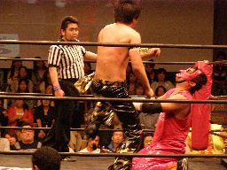 KUDOコーナーに上ってダイビングダブルニーアタック(左写真)。カバー、アントンが松井レフェリーの足を引っ張ってカウント阻止。