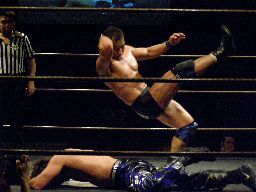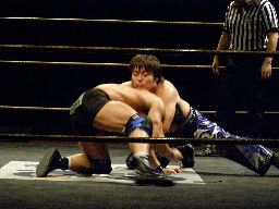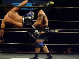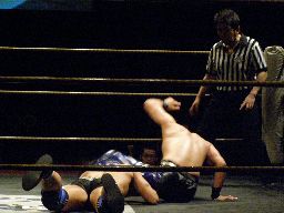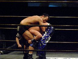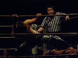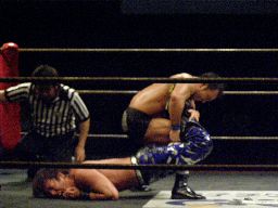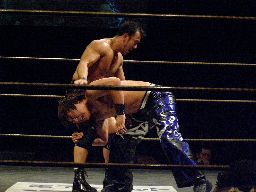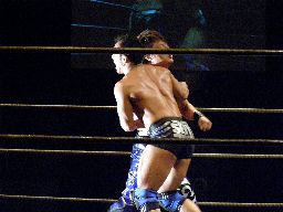 諸橋クリップラー・クロスフェース(右写真)、HARASHIMA引っくり返してエビ固め、カウント2。