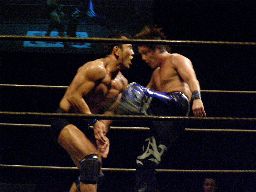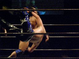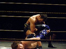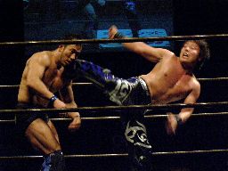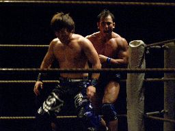 両者カウント7で立つ、HARASHIMAミドルキック連打(右写真)からファルコンアロー、カウント2。残り1分。