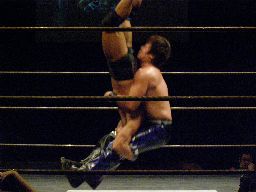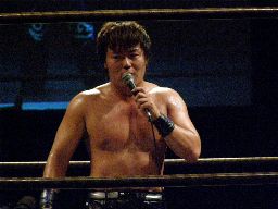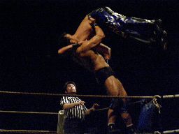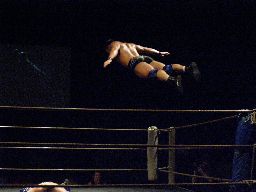 諸橋コーナーに上ってダイビングヘッドバット(左写真)、カウント2。