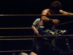 HARASHIMAコーナーに上る、諸橋も上ってヘッドバット連打から雪崩式ブレーンバスター(右写真)。15分経過。残り試合時間5分。いつの間にかディーノも会場の隅から戦いの動向を見つめていた。