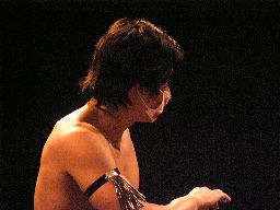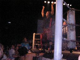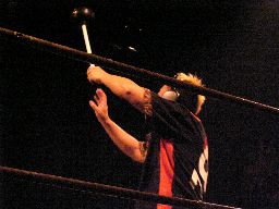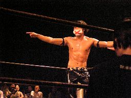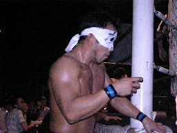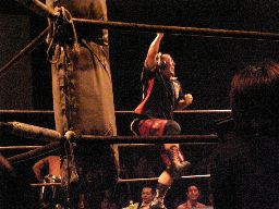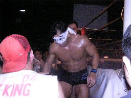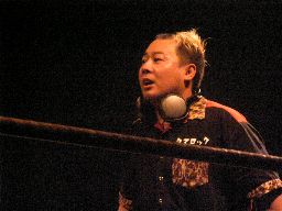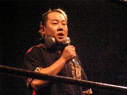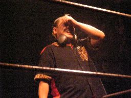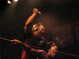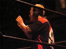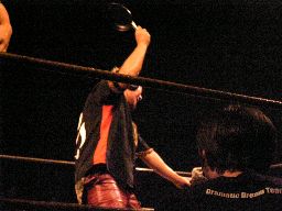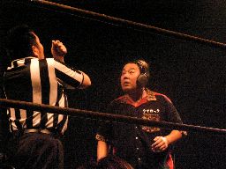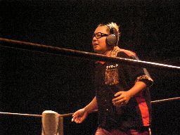 痛恨の猪熊(左写真)。猪熊「えー、皆さんに残念なお知らせがあります。本日のメインイベントはこれで終了とさせていただきます。」観客からのお約束的な「再試合」コールに「再々試合とします!」みたびヘッドフォンを着けて戦闘態勢に(右写真)。