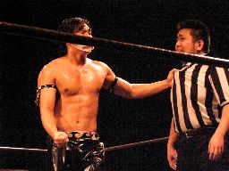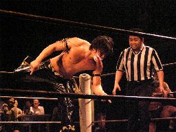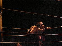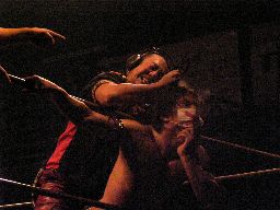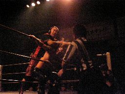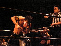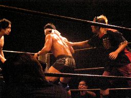 また2人で諸橋を攻撃(左写真)、ダブルでロープに振る、諸橋ロープに激突して場外エスケープ。
