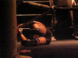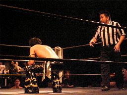 猪熊はKUDOを場外に出してエプロンから攻撃(右写真)。場外カウント進む。しかし猪熊には聞こえない。必死に戻ろうとするKUDOを猪熊は引きずり下ろす。諸橋は戻る気なし。そして20カウントが数えられる。