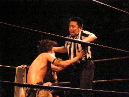 松井レフェリー今度は客席に出て猪熊に見えるように反則制止(左写真)。