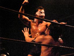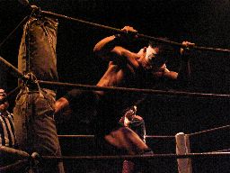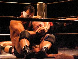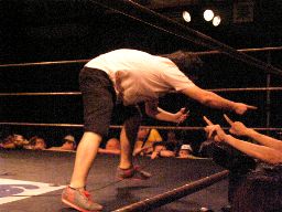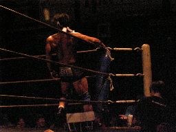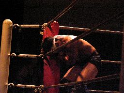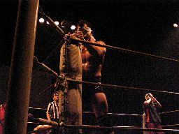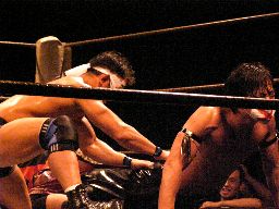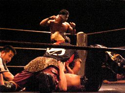 KUDOコーナーに上る、諸橋がロープを揺らす(右写真)、KUDOコーナーでクロッチ。
