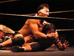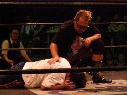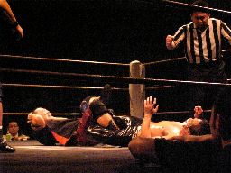 猪熊ボディスラムからカバー(右写真)、カウント1。諸橋もリングに戻る。