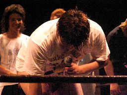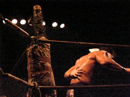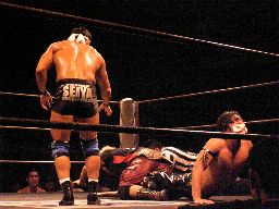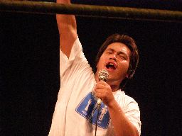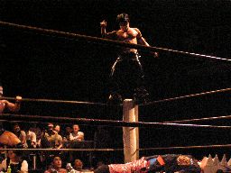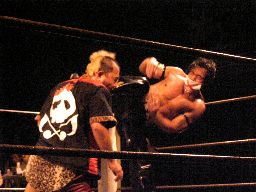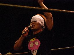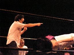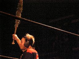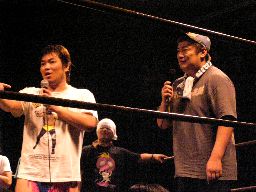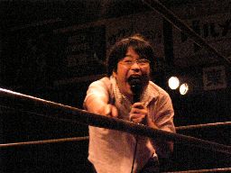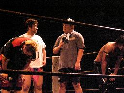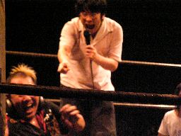 再びWild Thingが流れ大仁田劇場に(右写真)。レスラーたちは諸橋を残しさっさと退場。諸橋も逃げようとするが新藤リングアナに呼び止められ、「諸橋さん、キレてますね」と振られる。諸橋「キレてないですよ。」逃げる。