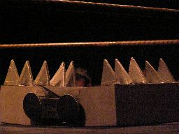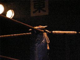 猪熊が有刺鉄線バット取り出す(右写真)。コーナーにガムテープでセット。