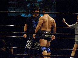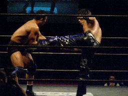 チョップとエルボーの打ち合い、HARASHIMAはミドルキック(右写真)。