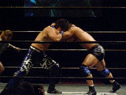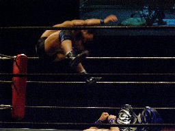 諸橋コーナーに上る、HARASHIMAも上るが諸橋はヘッドバットで落とす(右写真)。