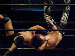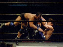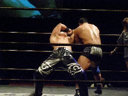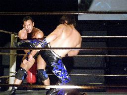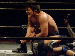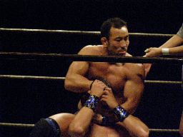 HARASHIMAロープを使って諸橋の腕を攻める、そしてキック、カバー、カウント2。HARASHIMAアームロックに(左写真)、諸橋ロープ。