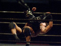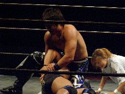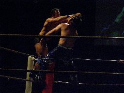 HARASHIMA蒼魔刀に行くが諸橋かわす。HARASHIMAハイキック、諸橋かわしてクォーラルボンバー(右写真)、カウント2。