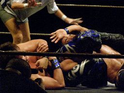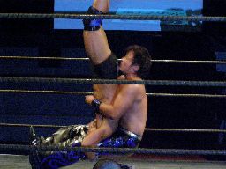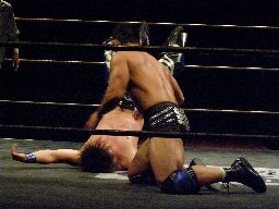 さらに腕にキック(右写真)、踏みつけ。ボディスラムからカバー、カウント2。サッカーボールキック。5分経過。