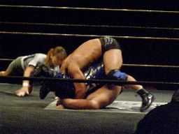 距離を取ると助走を付けて背中にドロップキック(右写真)。カバー、カウント2。HARASHIMAキーロック、諸橋ロープ。