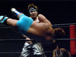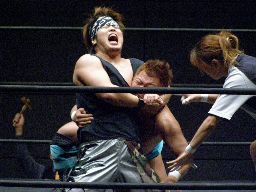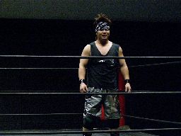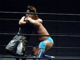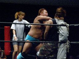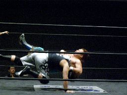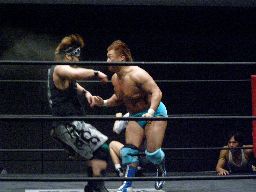 松永コーナーに振る、ウラノ切り返して突っ込む、松永トミーボンバー(右写真)、ウラノは場外エスケープ。ウラノはカウント18まで場外で体勢を整える。