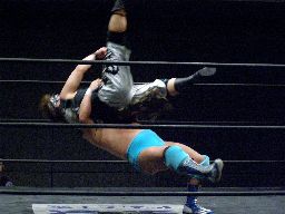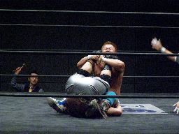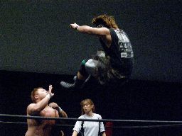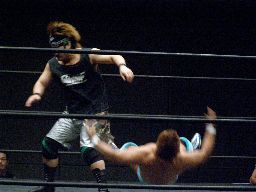 松永コーナーに振って突っ込む、ウラノかわしてフライングメイヤー(右写真)、そのままケサ固めで押さえ込む、カウント2。