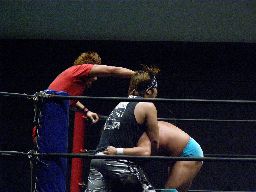ウラノバック取る、松永腕をひねる。ウラノ切り返してフライングメイヤー、松永ヘッドシザーズ、ウラノフライングメイヤー、松永ヘッドシザーズ、ウラノフライングメイヤー。両者立つ。松永ロープに振ろうとするがウラノは振らせない(左写真)。松永なんとかロープに振る、ウラノショルダーブロック、松永が立ち上がるとフライングメイヤー。