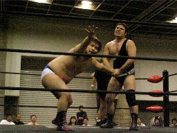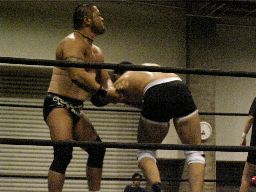 トーゴーアームストレッチからヘッドロック、ディーノがトーゴーの尻を触る(右写真)。トーゴーが睨み付けるとディーノは場外逃亡、そのまま4人で場外乱闘に。
