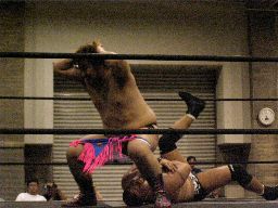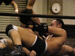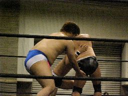 ロックアップ、トーゴーがロープに押し込む、クリーンブレーク。トーゴー腕をひねる(左写真)、正美切り返す、トーゴー切り返してグラウンドに引きずり込むと腕にニースタンプ。