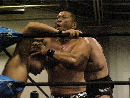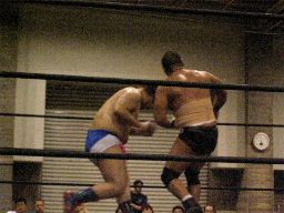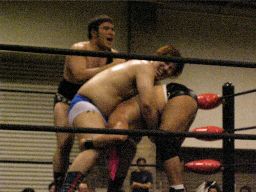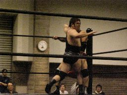 パンチの打ち合い、アントンがフラットライナー、カウント2。アントンロープに振る、正美かわすがトーゴーがビッグブーツ(左写真)。