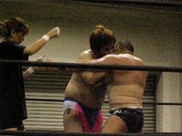 トーゴーと正美がリングに戻る。トーゴー正美の腕をひねってニースタンプ、正美が立ち上がってパンチ打つとサミング。アントンにタッチ。アントンはコーナーに詰めてバックハンドチョップ連打(右写真)