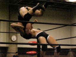アントンセカンドコーナーに上ってダイビングフィストドロップ(右写真)、ディーノがカット。アントンはディーノにサミング連発。