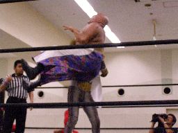 佐藤ボディスラムからコーナーに上ってダイビングプレス(右写真)、カウント2。