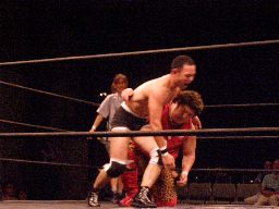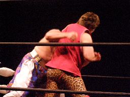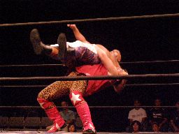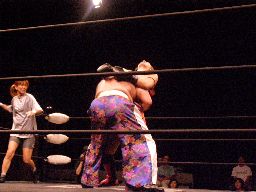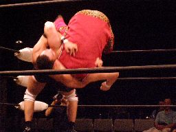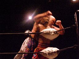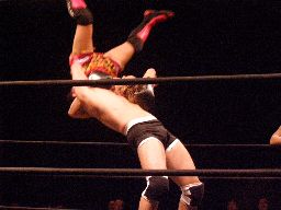 正美ブレーンバスター狙う、鳥羽ブロック。しかし正美は投げ切る(左写真)、星誕期にタッチ。