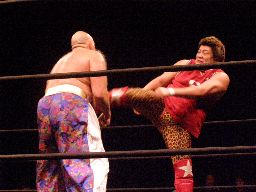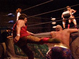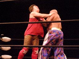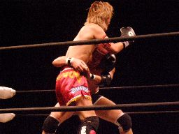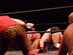 さらに連打(右写真)。坂井ロープに飛ぶ、星誕期ショルダーブロック。両軍タッチ。