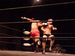 突っ込んできた鳥羽の首をつかんで正美は大外刈り、カウント2。正美バックドロップ狙う、鳥羽ブロック(左写真)してヒザ蹴り、カカト落とし、ミドルキック、カウント2。