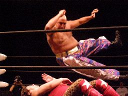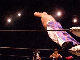 星誕期ストンピング、セカンドコーナーに上ってダイビングボディプレス(右写真)、鳥羽カット。