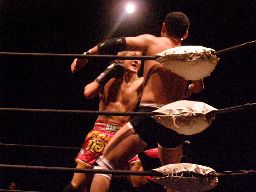 鳥羽パンチでブレークするとミドルキック(右写真)、正美キャッチしてエルボー。