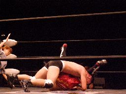 正美串刺しエルボーからダブルアームスープレックスで坂井の巨体を投げ(右写真)、星誕期にタッチ。