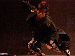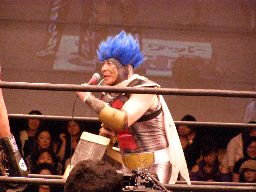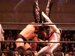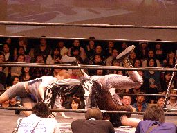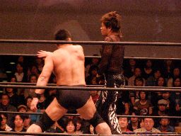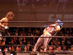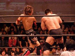 ジャカイダーコーナーに振って串刺しニールキック、MIKAMIの顔面にヒット。ジャカイダー再度突っ込む、MIKAMIトップロープを越えてエプロンに出るとコーナーに飛び乗って流星キック(左写真)、鳥羽にタッチ。5分経過。