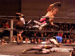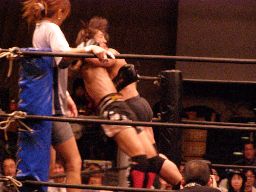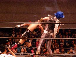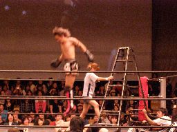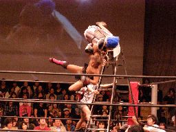 高木ラダーをコーナー近くに立てると上る、鳥羽が阻止に回るがジャカイダーがロケットパンチで撃墜。ラダーに上ったMIKAMIを高木が雪崩式パワーボム(左写真)、MIKAMIウラカン・ラナ(?)で切り返す。